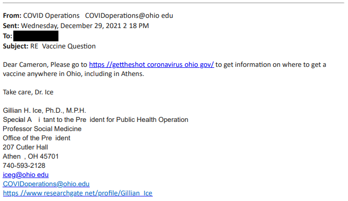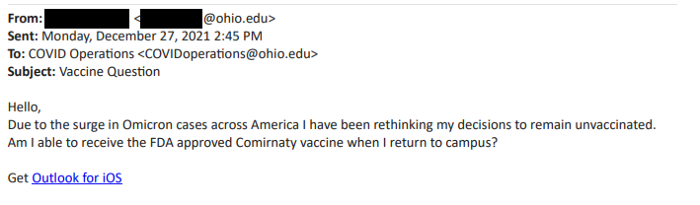 A student who wishes to remain anonymous (because of the frequent attacks by students and staff at Ohio University against unvaccinated students) sent the following email to the Ohio University COVID Operations email.