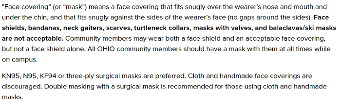 I have to give OU some credit, after 2 years they finally admitted cloth masks like the ones Ohio University provided students DO NOT WORK. but instead of doing the right thing and making masks optional OU has mandated different masks that studies show are just as ineffective. Here you can find 150 studies and publications proving masks including N95’s are ineffective and may even cause harm.