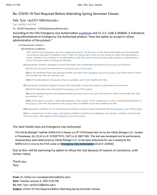 What Ohio University doesn’t want students to know is According to the FDA Emergency Use Authorization guidelines and 21 U.S. Code § 360bbb–3 individuals being administered an Emergency Use Authorized product “have the option to accept or refuse administration of the product.”