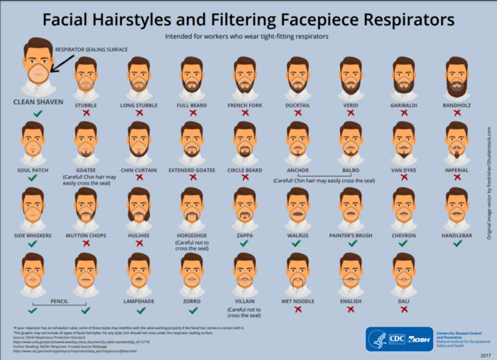 If you have any of the below facial hairstyles with an X you SHOULD NOT wear a KN95s or equivalent according to the CDC.