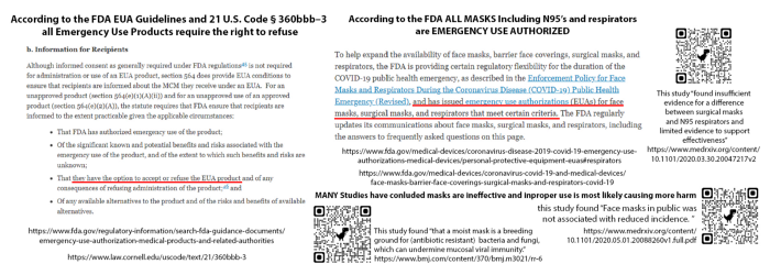 Luckily for those who do not want to wear a mask, another thing Ohio University does not want you to know is that ALL MASKS AND RESPIRATORS are EMERGENCY USE AUTHORIZED. I created the graphic below so you can easily and quickly show people it is your legal RIGHT to refuse to wear a mask. It also proves that all masks even KN95s and equivalents are EUA. it also includes 3 studies proving masks and N95’s are ineffective and even harmful. you can find 150 studies and publications proving this Here. Forcing you to wear a mask is a violation of US Federal Code and FDA guidelines.