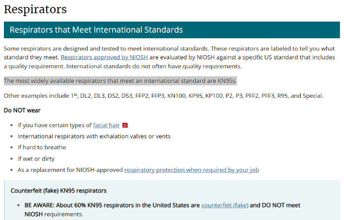The CDC says there are many reasons and scenarios were you should NOT wear a KN95s mask. These reasons include having certain types of facial hair, masks with valves or vents should not be worn, it should not be worn if you find it hard to breathe, you should not wear a mask if wet or dirty, and you should not wear a counterfeit mask. The CDC also says about 60% of KN95s masks are fake and will not provide the same protection.