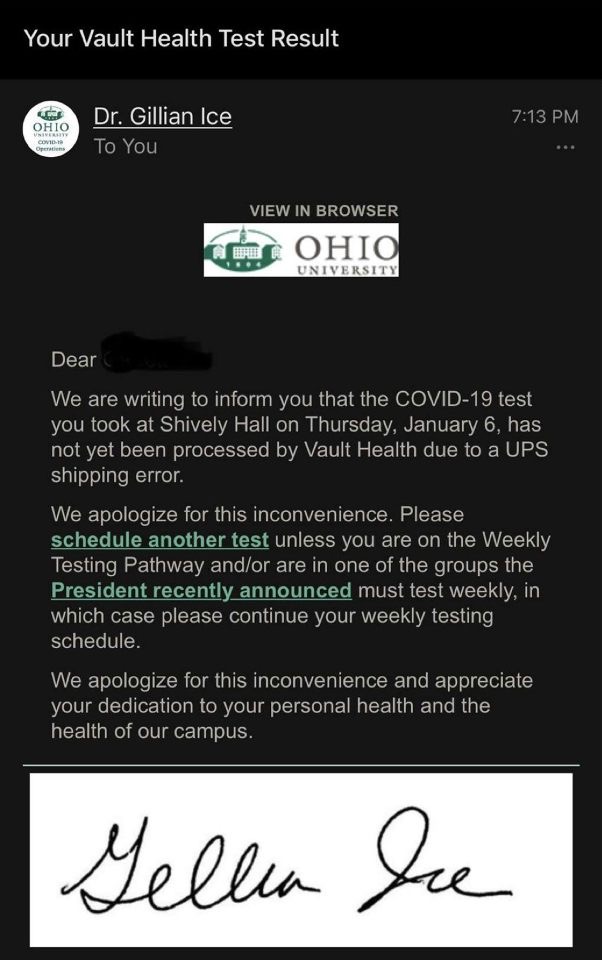 Many students received an email from Gillian Ice saying their test couldn’t be processed and students must schedule another test. Required weekly testing is only going to cause more problems as we talked about here.