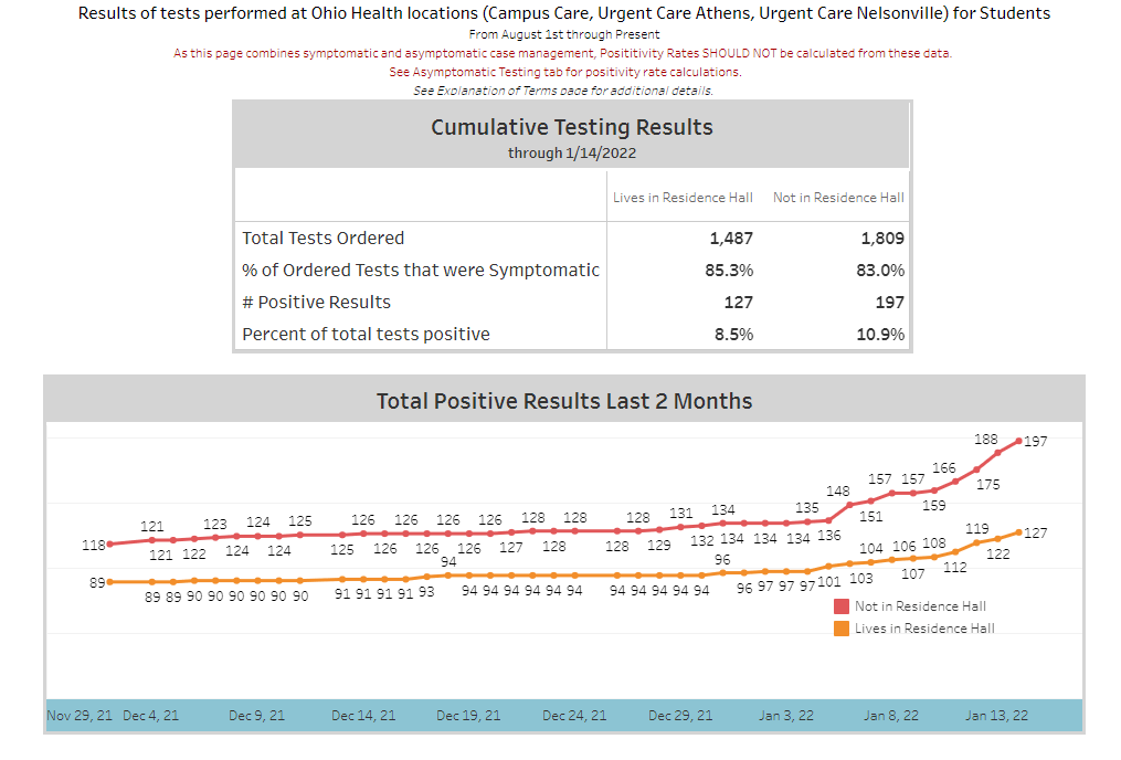 The update goes on to claim COVID Operations managed approximately 3,200 cases of COVID since New Years Day, approximately 2,200 of which were detected before students returned. Which should mean 1,000 cases were detected on campus. Which is weird since the Ohio U COVID Dashboard says only 324 students have tested positive in the past 2 months. The below screenshot was taken yesterday after the COVID dashboard was put back up after being un-updated for a week and then taken down.