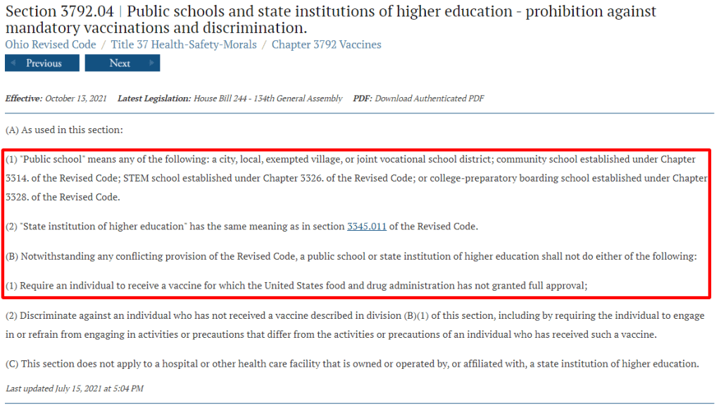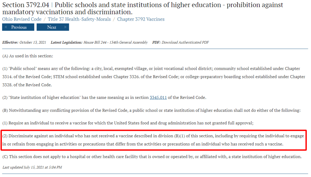 Ohio R.C. 3792.04 also clearly states: A public school or state institution of higher education shall not Discriminate against an individual who has not received an Emergency Use Authorized vaccine.