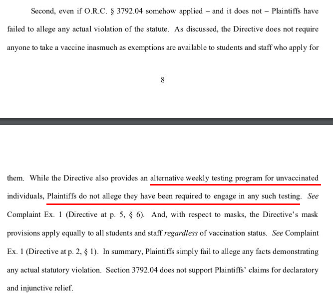 Ohio University also says Ohio R.C. 3792.04 does not apply because while they admit discriminating against the unvaccinated with a weekly testing program, they claim we do not allege we have been required to engage in such testing, this is obviously not true.
