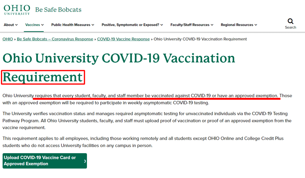 As of today months after being served with the lawsuit would you say Ohio University’s vaccine mandate page reflects something that is “not required”? There is no guarantee anyone’s exemption would be approved and many were not. The only sure way to not be kicked out of Ohio University was to get an Emergency Use Authorized COVID vaccine.