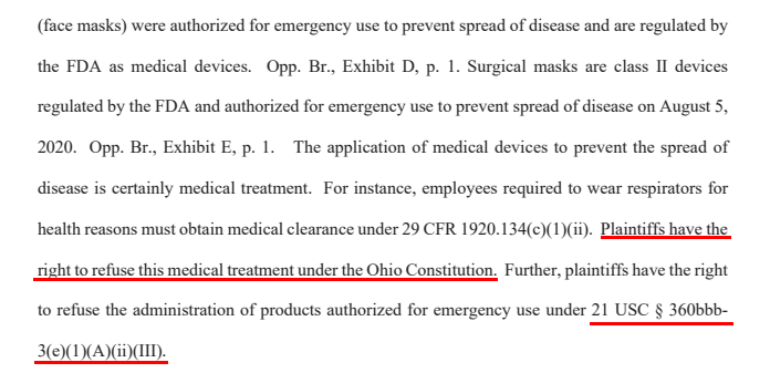 Furthermore, The Ohio Constitution and Federal Law 21 United States Code 360bbb-3(e)(1)(A)(ii)(III) Gives Ohioians the right to refuse Emergency Use Authorized products. This includes all available COVID-19 vaccines, All Masks, and all COVID Tests.