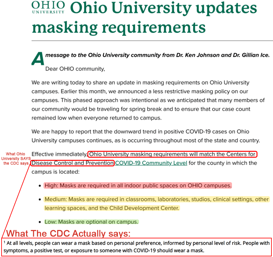 Despite the CDC’s guidance Ohio University only actually follows this guidance, federal law, and your right to refuse medical treatment as an Ohioan when the county level is low. As they admit below in their cited webpage.