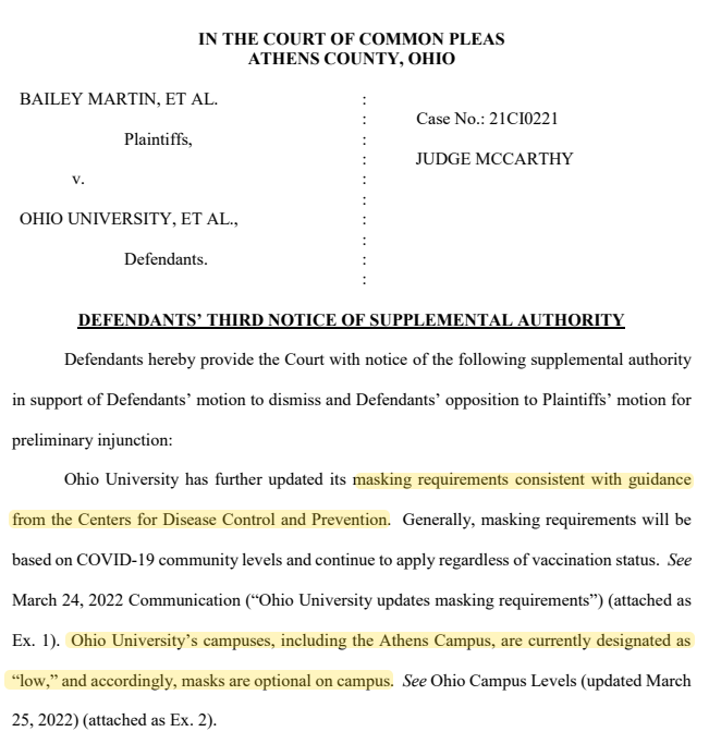 Since Ohio U has updated their guidance on testing and masks they have filed 2 New Notices of supplemental authority. Notices of supplemental authority are used to advise or inform the courts of changes Ohio U has made to their restrictions relevant to the case. First you can catch up on our previous post about the initial mandate changes and see how these mandates still violate the law. Since that post the mask mandate has again been updated but remains unlawful as we will discuss towards the end of this press release.