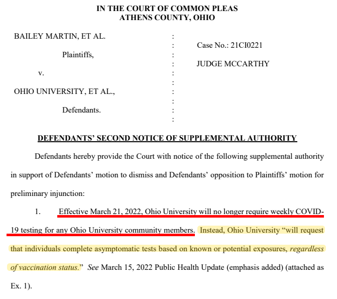 Ohio U Implies in their health update they cited in the filing that COVID surges made the requirements necessary and they can only be relaxed now because of the low spread in Athens. This implies what we already know, Ohio University will again illegally mandate testing once cases and hysteria of new surges increase enough to justify again forcing Emergency Use Authorized tests on students and staff. That is why our lawsuit is still relevant in the case of testing.
