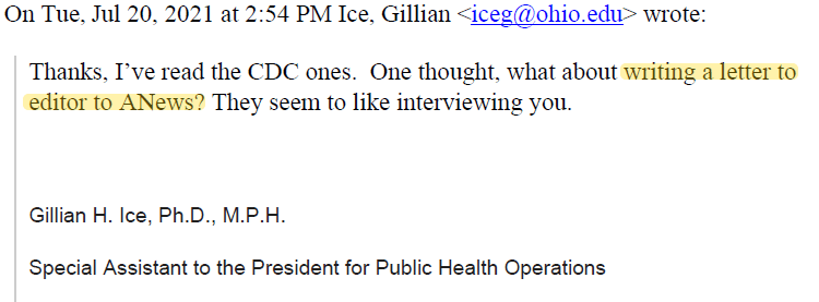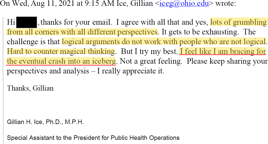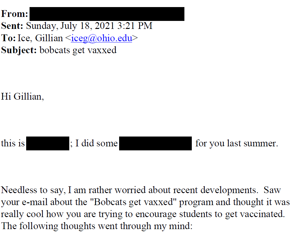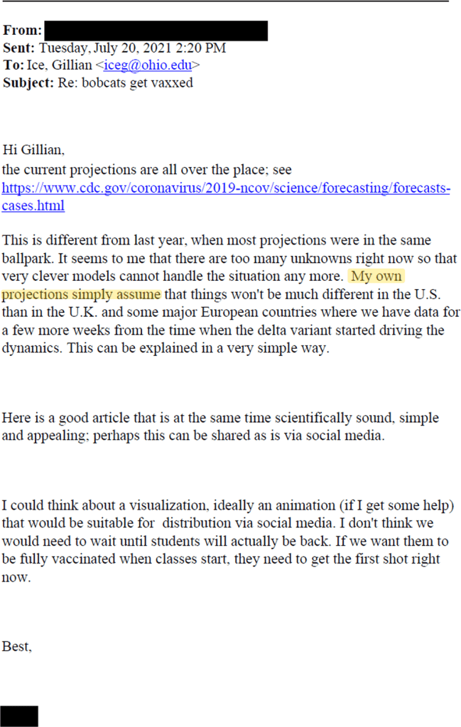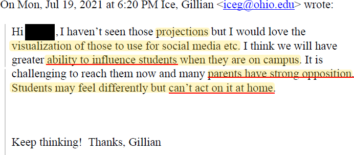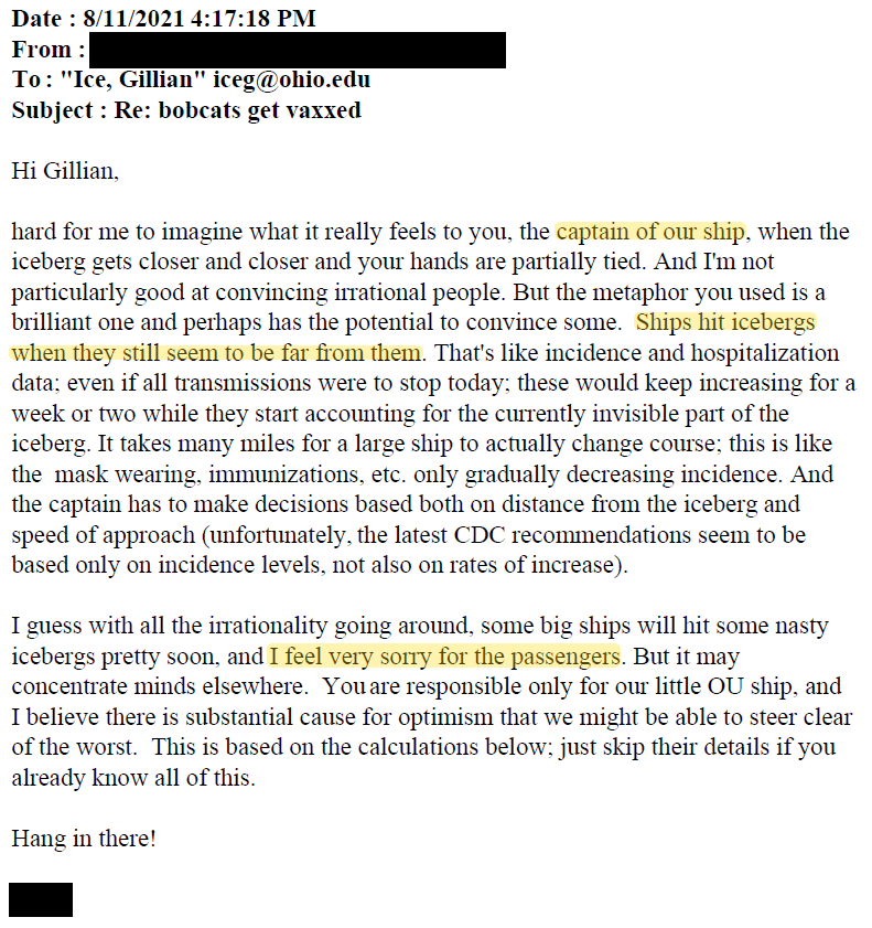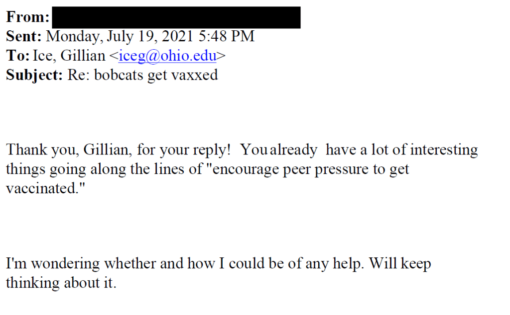 Let’s go back to July 18th, 2021. Gillian Ice received an email from someone who is not a public employee so their name and identifying information has been redacted. The person praised Gillian for encouraging students to take the still experimental spike protein delivery vaccines through the “Bobcats get vaxxed” program and shared their thoughts.