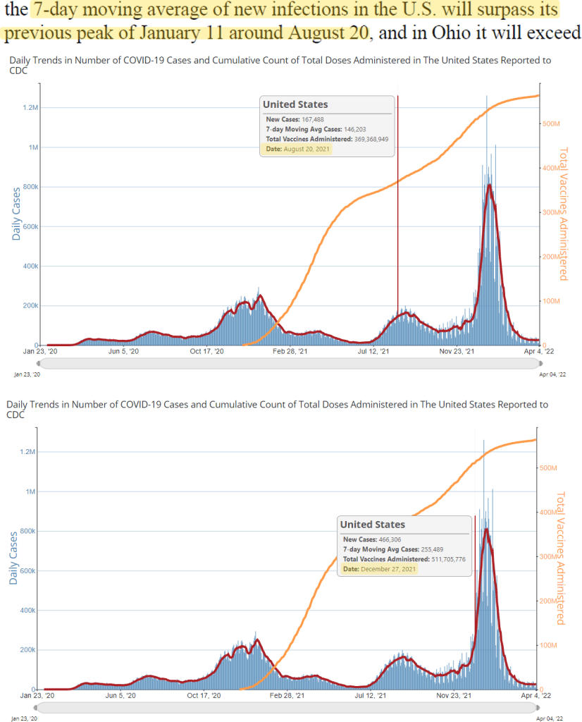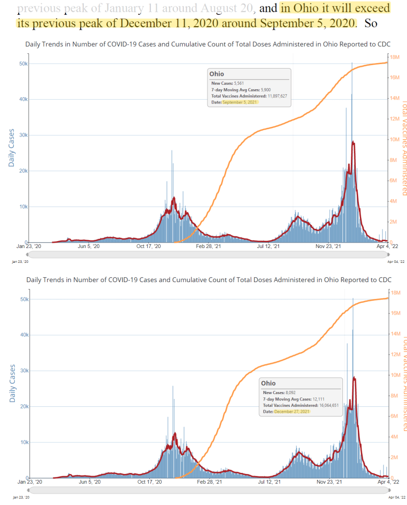 Next, the person claims the Ohio 7 Day moving average would surpass the previous peak around September 5th. According to the CDC the Delta surge actually never surpassed the previous peak in Ohio and the 7-day average didn’t either until the Omicron surge December 27th, over 3 months after the person estimated. After over 16 million EUA COVID-19 vaccines had been administered in Ohio.