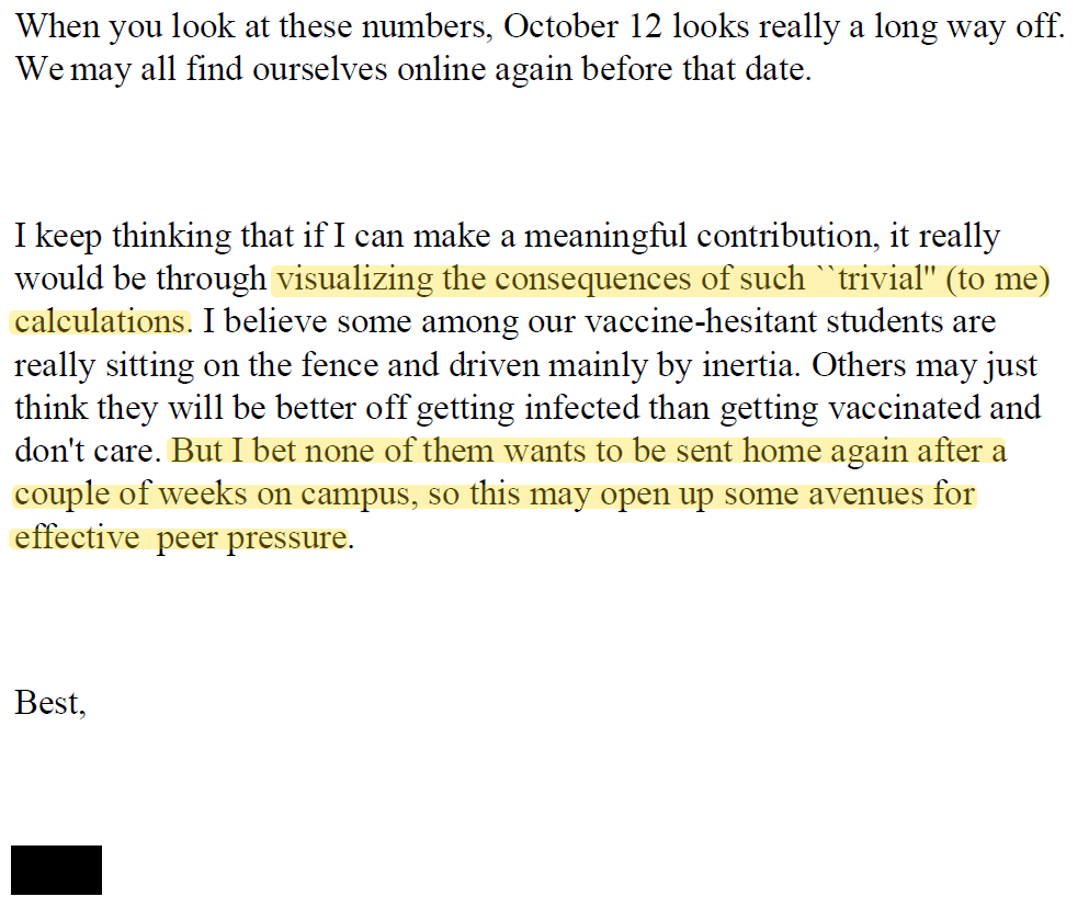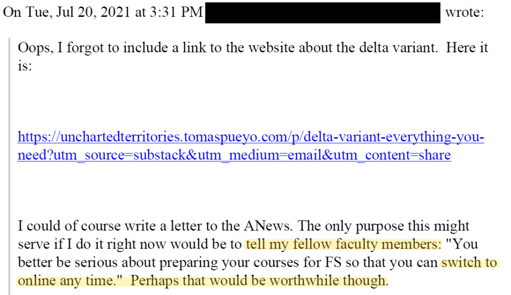 The same day the previously unknown redacted name person replies, admitting they are a member of a school’s Faculty. They also say their best idea is threatening their fellow faculty members that courses may “switch to online any time” if they do not get and encourage the experimental jab.