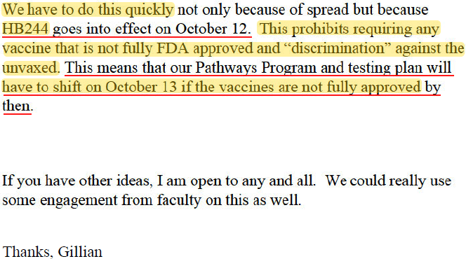Gillian is eluding that the “peer pressure” she wanted to use involved discriminating against the people who had not received the Emergency Use Authorized injection. This would be done by keeping the unvaccinated out of class and requiring the unvaccinated to wear a mask, and requiring the unvaccinated remain distanced from their vaccinated friends who would not have to miss class, wear a mask, or remain distanced. As we will discuss in a second thankfully HB 244 stopped this discriminatory “peer pressure” from taking place. The “others” Gillian refers to is likely someone who actually understands the law and CDC guidance unlike Gillian.
