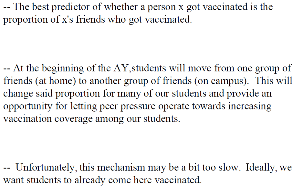The person’s first shares that people who have more friends who are vaccinated feel more peer pressure to get vaccinated. This person wants students to inject themselves with an Emergency Use Authorized vaccine not because it’s safe, not because it’s effective, not because COVID is a big risk to them (it’s not), but because their friends are doing it.