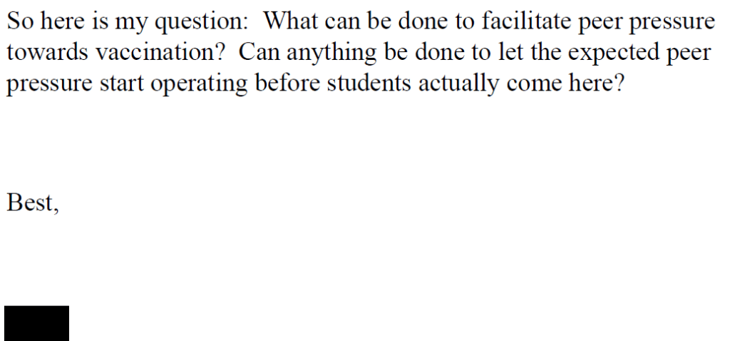 After all this, this person recommends unvaccinated students be “peer pressured” by being sent home after a few weeks on campus if they do not get vaccinated, which is blatantly anti-science, discriminatory, and unethical.