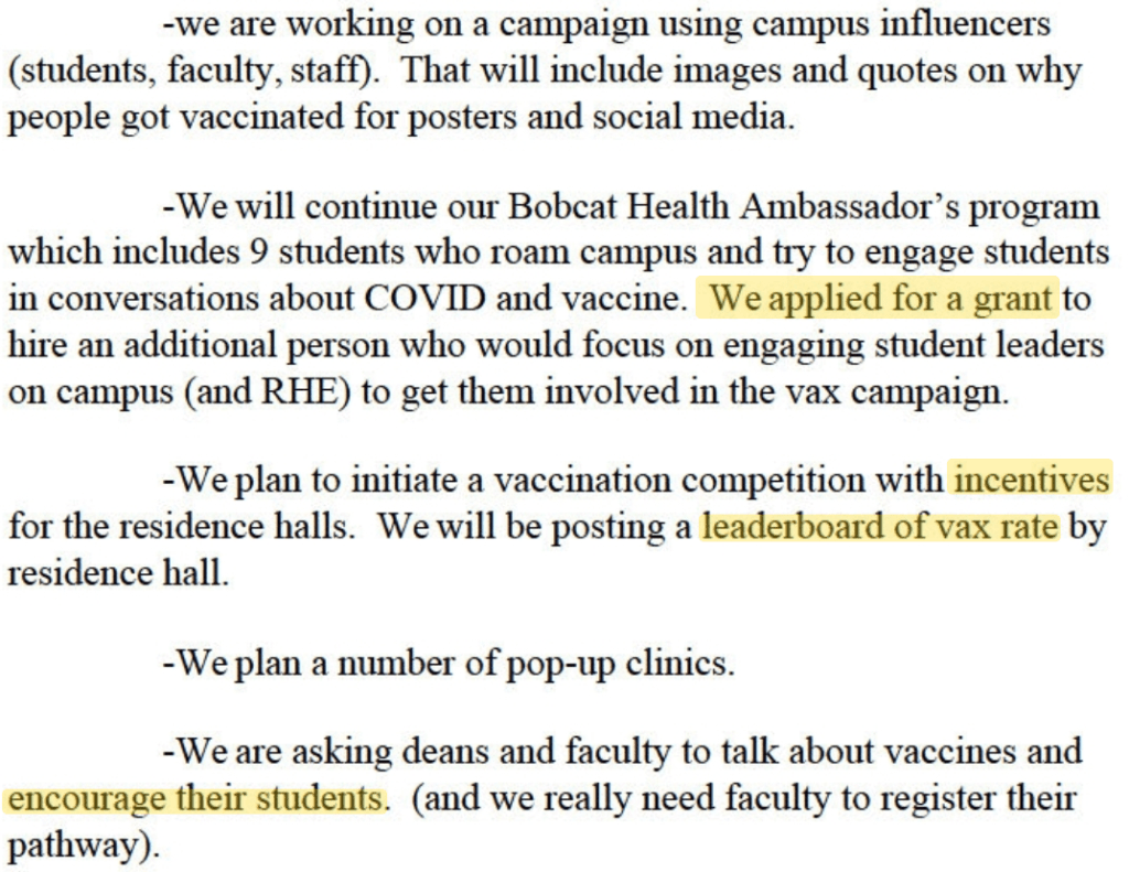 Gillian then lists off the “peer pressure” and vaccine promotion she was ‘allowed’ to use. This including campus injection influencers, 9 students roaming the campus to talk to other students about taking the needle injection, Applying for a grant to hire someone to engage students leader about taking the experimental injections, Incentives including like money and rewards in exchange for taking the experimental injection, a leaderboard to see what residence hall had jabbed themselves the most, pop-up clinicals for easy access to the emergency use authorized needles, and asking deans and staff the encourage their colleges to get themselves injected. Seems ethical when you put it that way, huh?