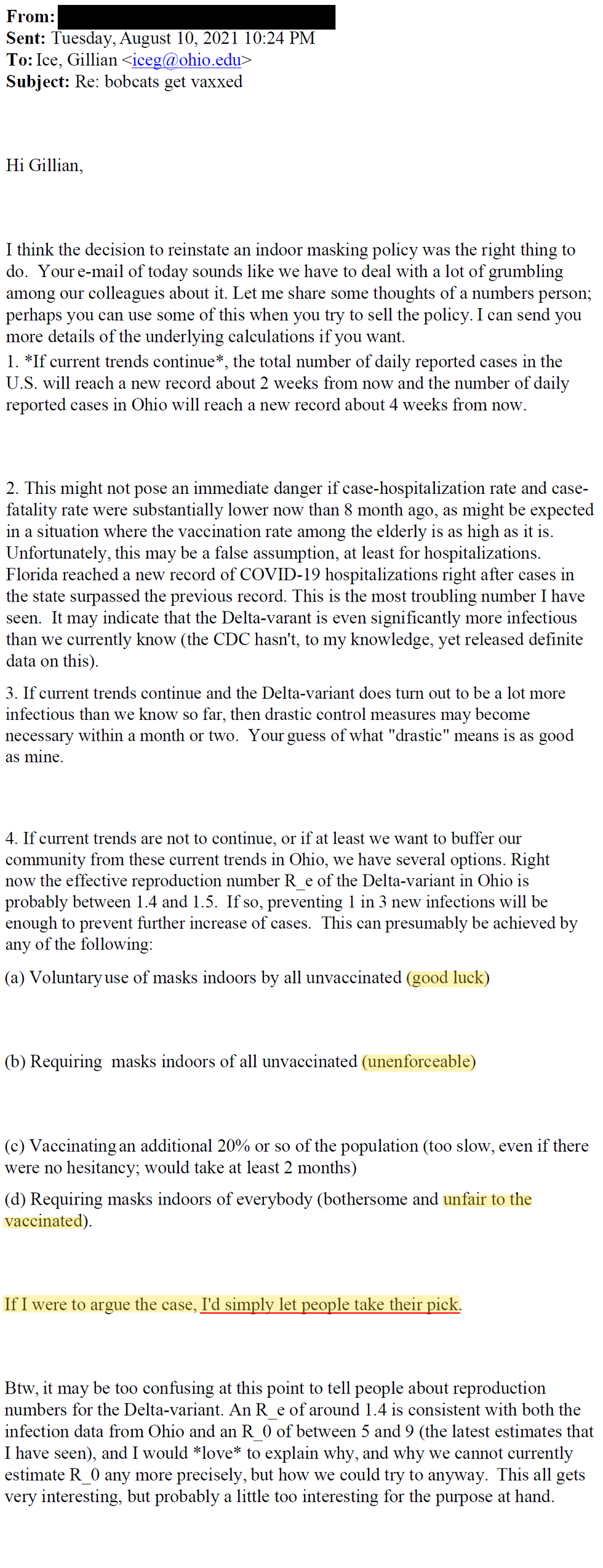 Gillian did not reply to the persons email. A little over 2 weeks later they sent another email after masking for all was reinstated. They share some more misinformed reasons why they personally live in fear. They admit the unvaccinated wont voluntarily wear masks, they admit required masking for the unvaccinated is unenforceable because it’s illegal, they admit they care about fairness for the vaccinated (after saying how much they want to discriminate against the unvaccinated), and finally come to what is the only sensible conclusion, that people should take their pick whether they wear a mask or not, as our lawsuit seeks to prove is everyone’s right under Ohio law anyways.