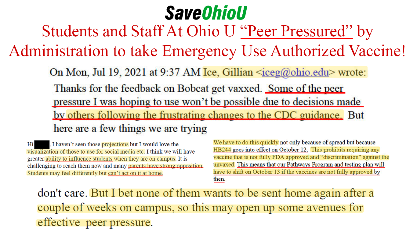 the Ohio Public Records Act or the “Sunshine Laws.” requires that public meetings be open to the public, that public records be open and available to the public and that public records be maintained in such a manner that they will be available to the public upon request. People employed by public university’s are government … Continue reading Emails: Some of The “Peer Pressure” Gillian Ice was “Hoping To Use Won’t be Possible Due to Decisions Made by Others Following The Frustrating Changes to The CDC Guidance.”