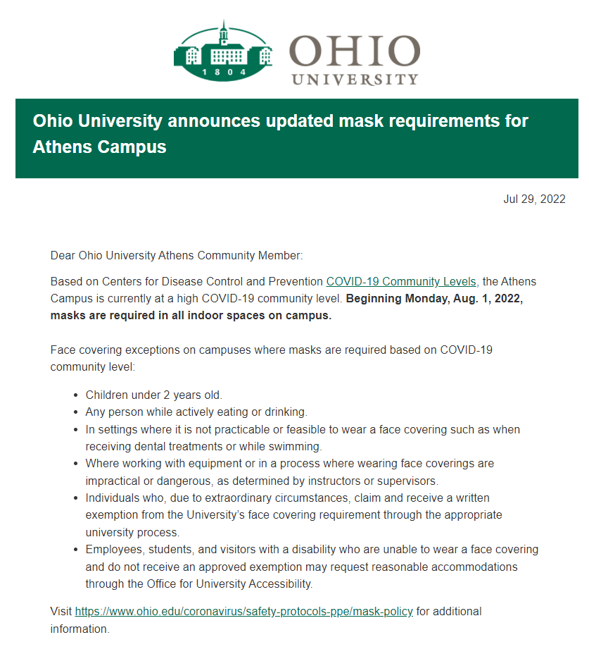 It is no secret Ohio University always waits until it’s too late for most people to viably transfer or make changes to their plans. This is exactly why Ohio University kept it a secret that they actually brought back the mask mandate over a month ago: