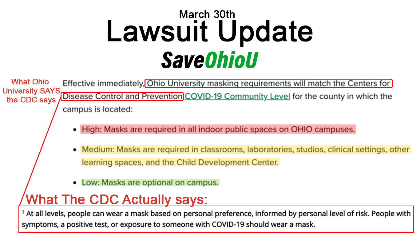 Since Ohio U has updated their guidance on testing and masks they have filed 2 New Notices of supplemental authority. Notices of supplemental authority are used to advise or inform the courts of changes Ohio U has made to their restrictions relevant to the case. First you can catch up on our previous post about theContinue reading “Press Release: March 30th Lawsuit Update”