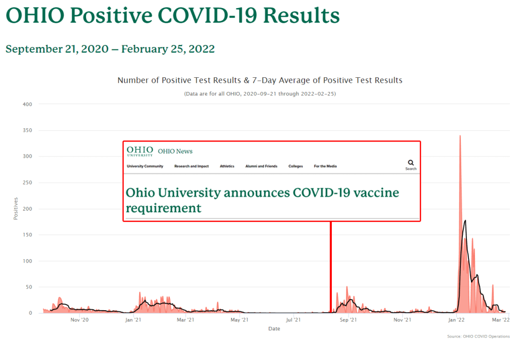 December Last year 15 Ohio University Students and a Professor filed a lawsuit against Ohio University to end their illegal and discriminatory COVID mandates. You can learn about the original lawsuit filing here, it is recommended you read that first before this to get caught up. Since then OU has only seen more COVID policy failure and our case has only strengthened.