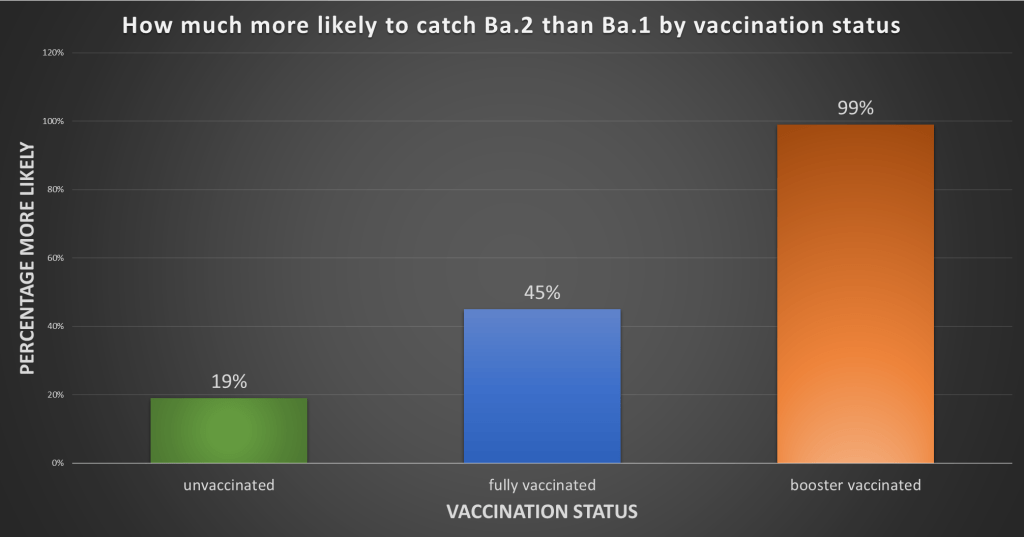 This study from Denmark concluded that “Omicron BA.2 is inherently substantially more transmissible than BA.1, and that it also possesses immune-evasive properties that further reduce the protective effect of vaccination against infection”