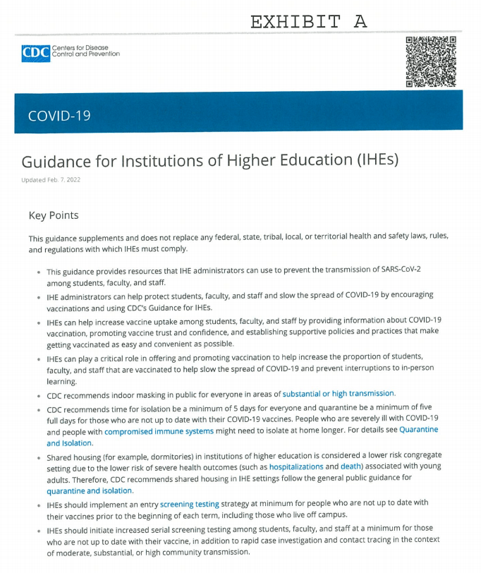 The CDC further emphasizes in its introduction that Ohio University determine how to implement the guidance “in accordance with applicable law”. and states that this guidance does not replace any applicable federal, state, or local health and safety laws, rules, and regulations. That’s from the document Gillian Ice Submitted in her Affidavit defending the mandates, Thanks Gillian!