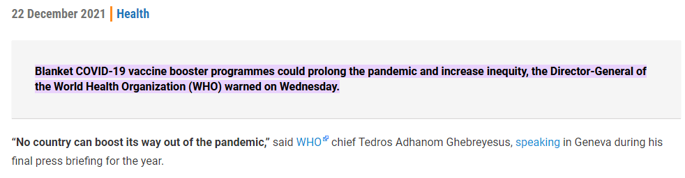 Last December the WHO even warned about the dangers of boosting too much. The Director-General of the WHO warned boosters could PROLONG THE PANDEMIC AND INCREASE INEQUALITY. Maybe that’s actually why mainly the democrats want boosters, because they have been prolonging and increasing inequality this whole time.