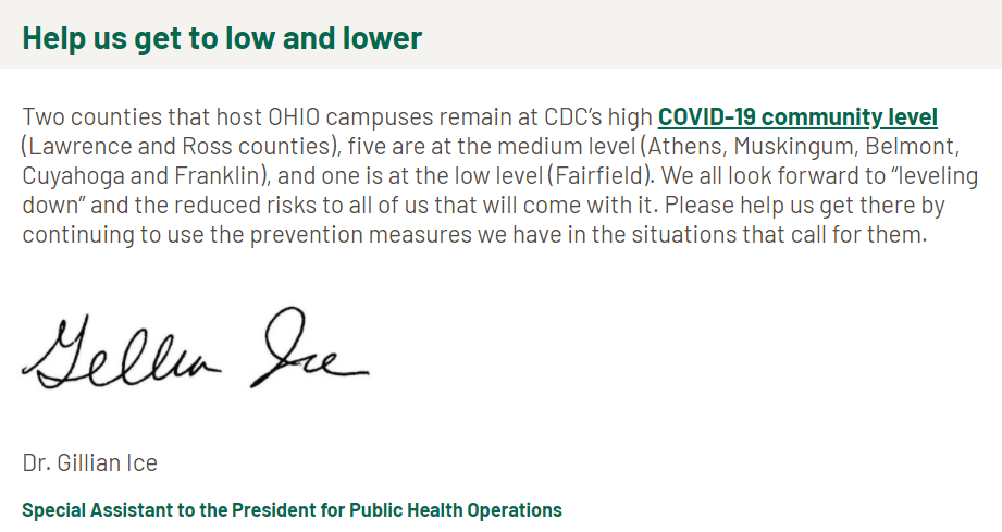 Tuesday, March 15, 2022 Gillian Ice sent out another “Public health update” via email to Ohio U students and staff. This email refreshingly has much less misinformation than previous updates, but it’s also short.