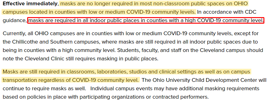 Masks are also required in classrooms, laboratories, studios, clinical settings, and other similar learning spaces, even on OHIO campuses located in counties with low or medium COVID-19 community levels, again this is despite the CDC specifically providing guidance not to require this.