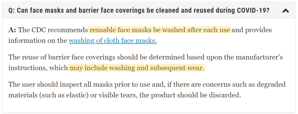 Ohio University’s requirements and recommendations are not only wrong they are clearly dangerous and the opposite of the CDC’s recommendations. The CDC recommends reusable face masks to be “washed after each use“
